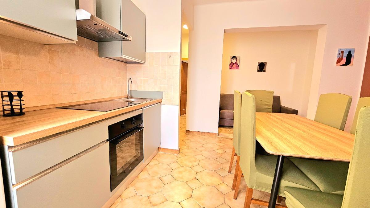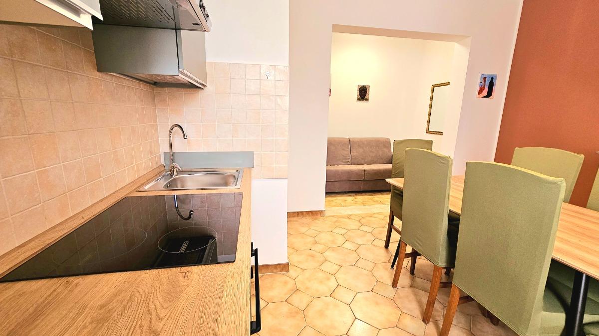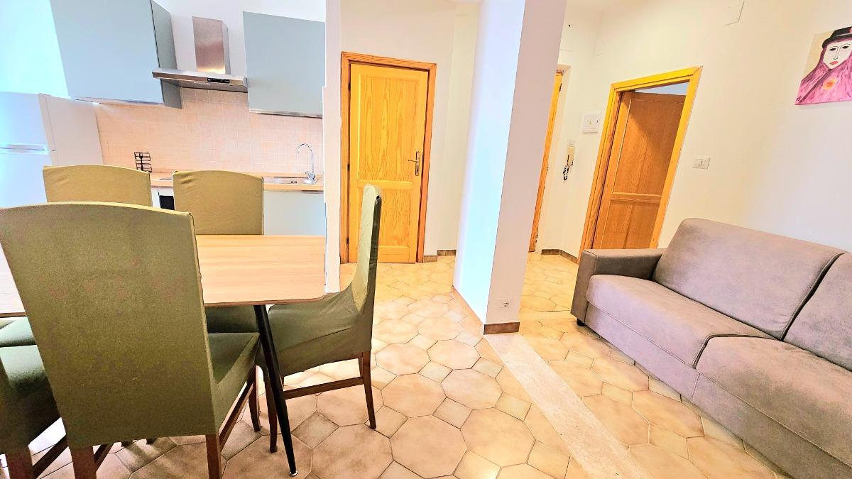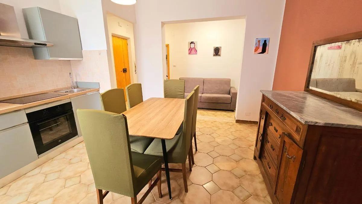 L'appartamento è spazioso e luminoso, caratterizzato da un affascinante mix di arredo moderno e mobili d'epoca. Appena entrati, ci si trova in un ampio open space con una cucina completamente attrezzata, inclusa di piano cottura a induzione e un kit di benvenuto contenente pasta, caffè, biscotti, latte e acqua. La zona giorno comprende anche un comodo tavolo con sei sedie, un frigorifero e un divano letto matrimoniale.