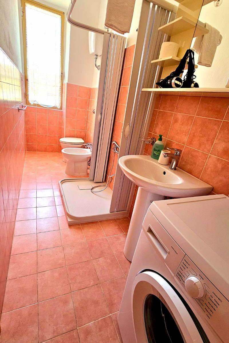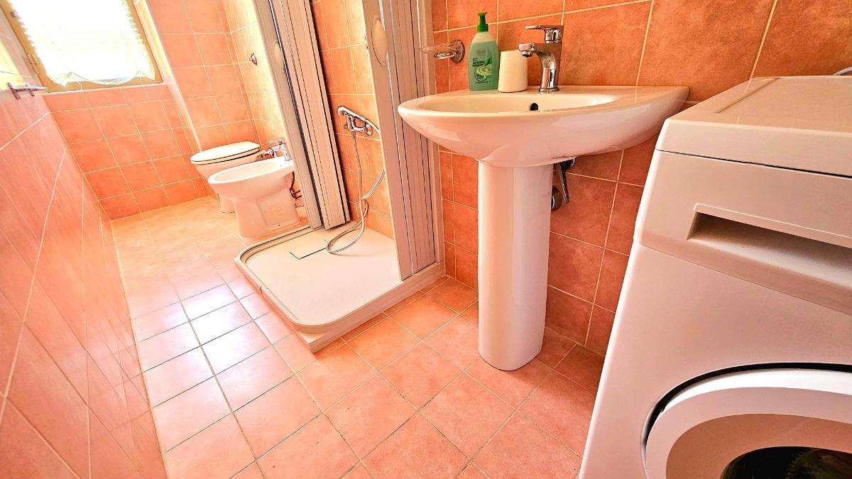 Il bagno, finestrato e ben ventilato, è provvisto di wc, bidet, doccia, lavandino e lavatrice, offrendo tutti i comfort necessari per un soggiorno piacevole.